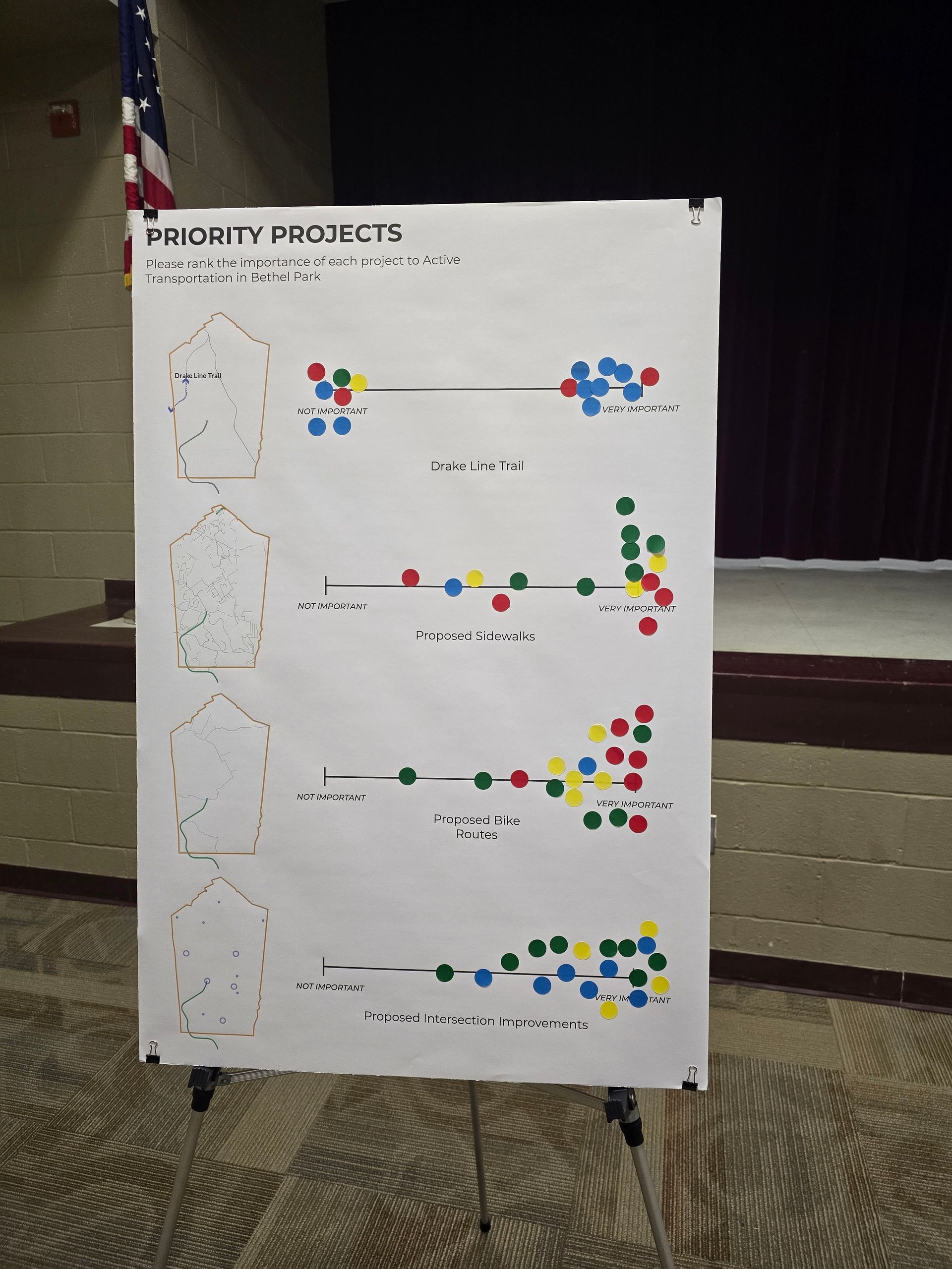 It helps us identify projects and policies that will improve our infrastructure and make walking, biking and wheeling through our community safer and more convenient. We’ll also identify where public transportation services are needed most and how we can work with our regional partners to improve access to public and shared transportation services. An adopted Active Transportation Plan will identify and prioritize projects to improve connectivity and outline strategies to fund infrastructure improvements. It will also make Bethel Park more competitive when applying for grants to implement Active Transportation Improvements!