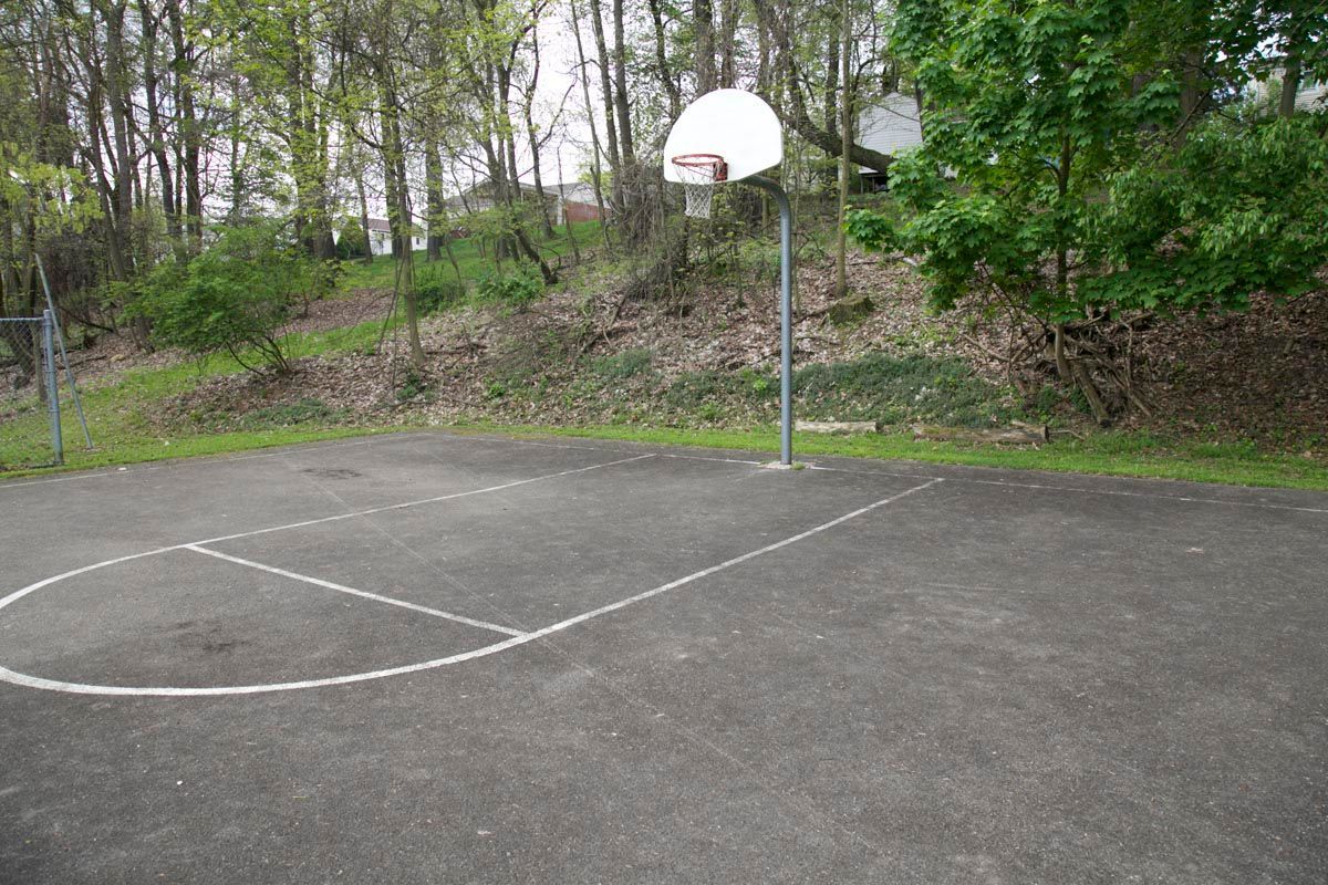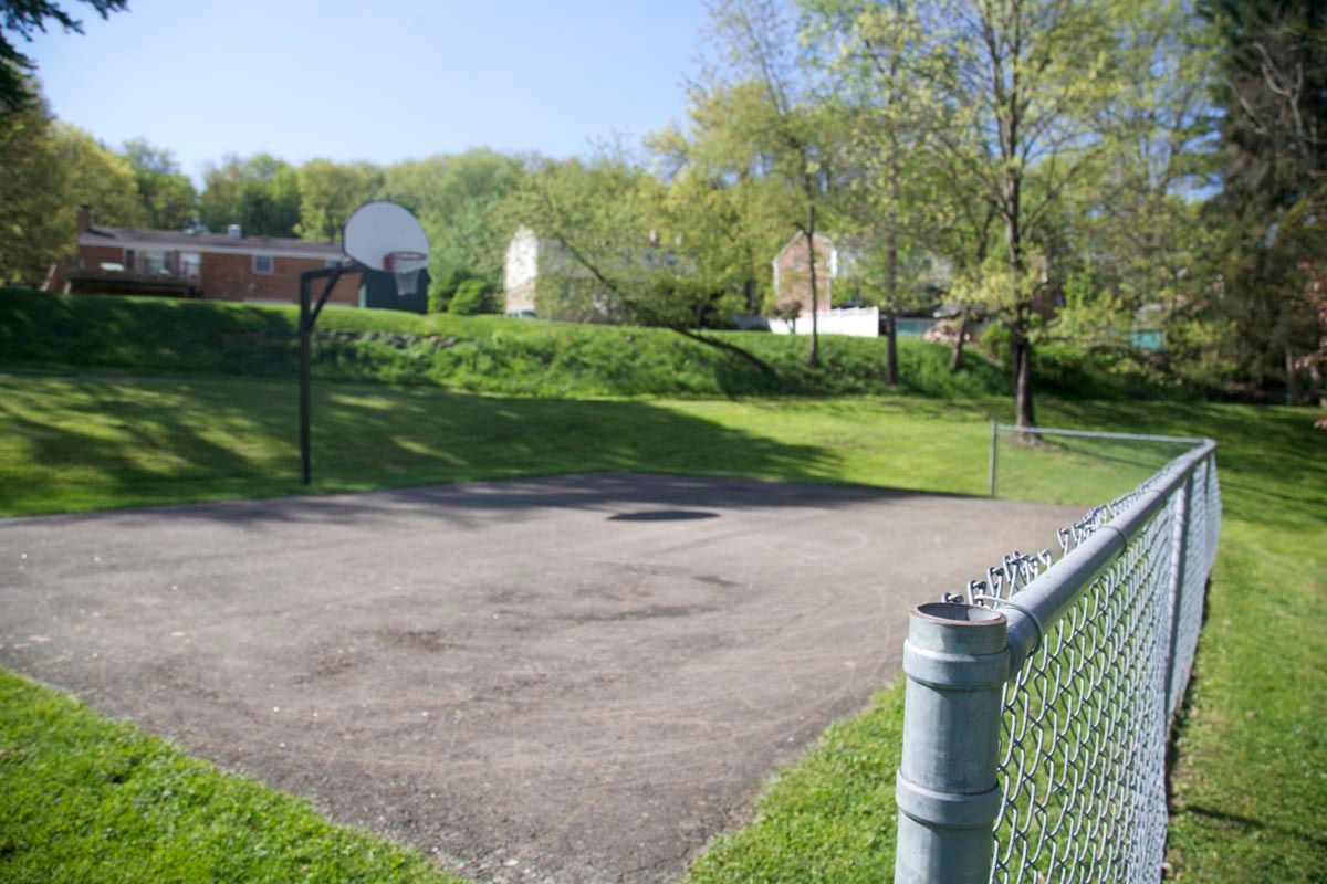 Pavilion w/ table, Play apparatus with two slides, climbing structures, 1 track ride, ½ basketball court, spring toy, swing set |