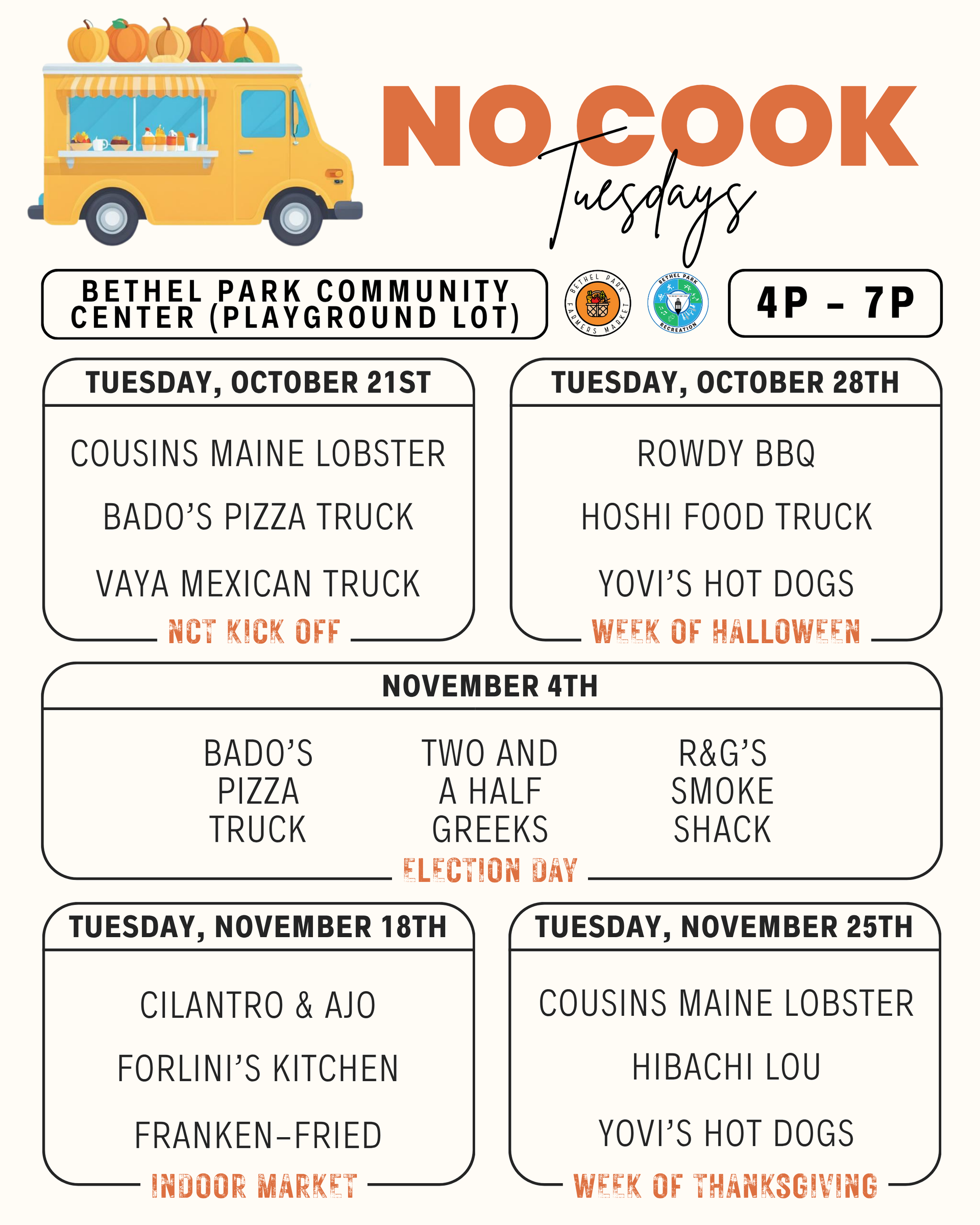 Sign up to get e-mail reminders and the list of food trucks available each week during No-Cook Tuesday season.
